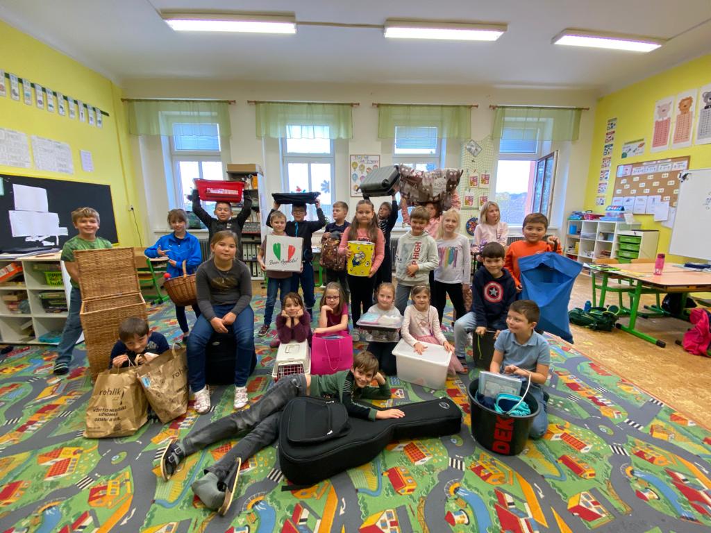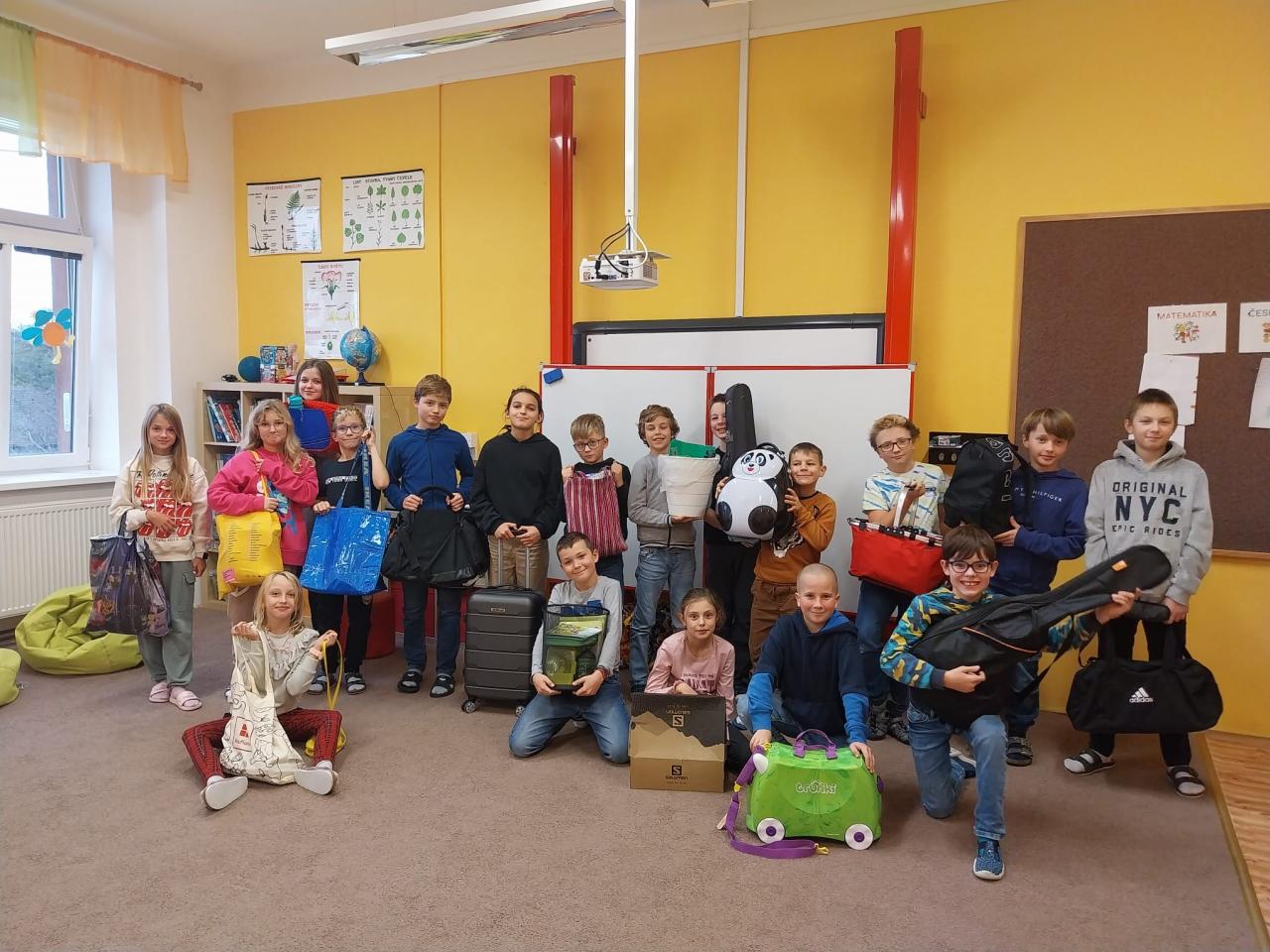 Žáci prokázali tvůrčího ducha a pomůcky přinesli v autíčkách, polštářích, plyšácích, kufrech, kočárčích, přepravkách a dalších bláznivých nosičích.